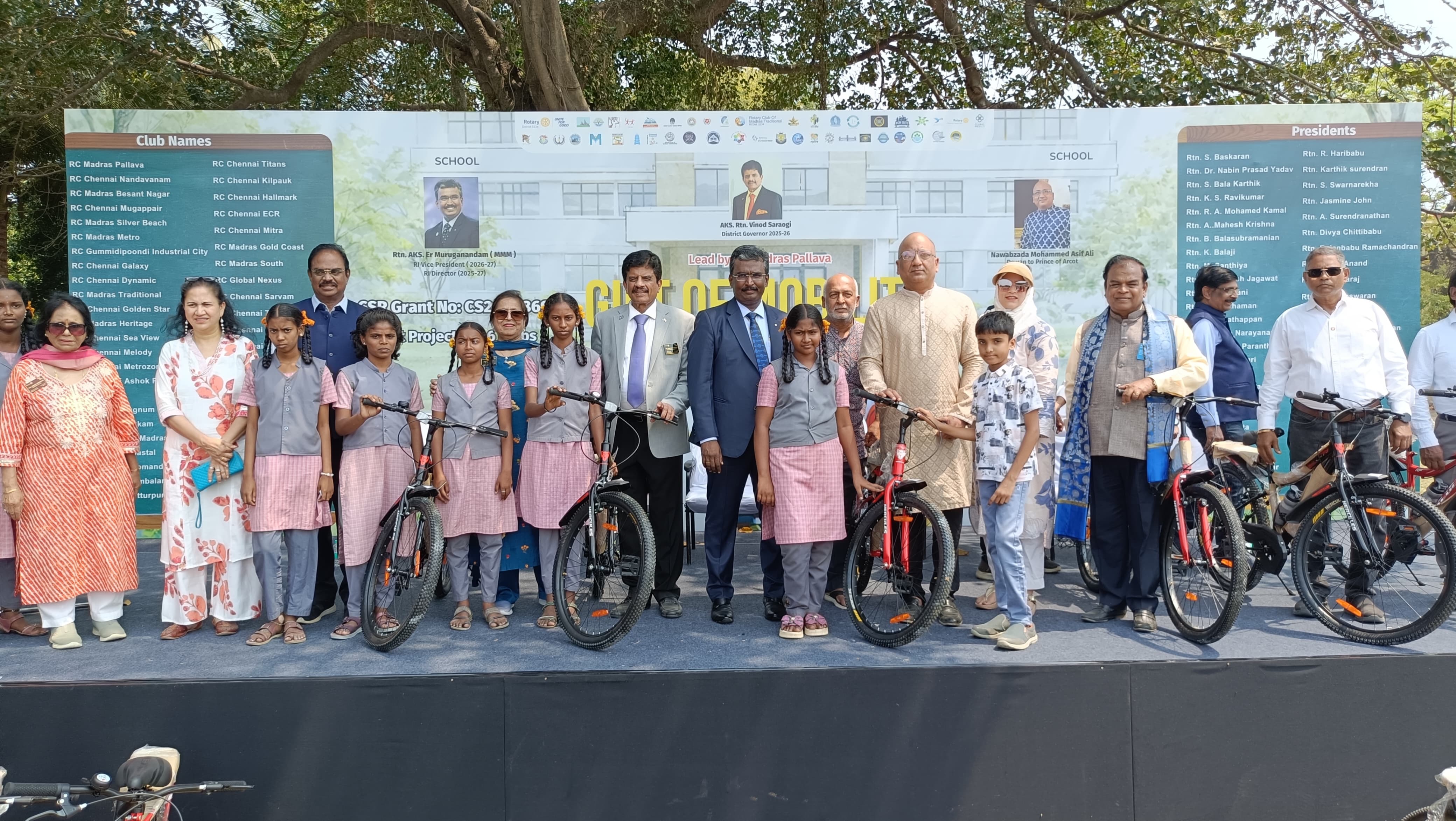 The event was graced by Chief Guest Rtn.AKS.Er Muruganandam (MMM), RI Vice President (2026–27) and RI Director (2025–27), who commended the scale and impact of the initiative. He emphasised that mobility is directly linked to opportunity and that such interventions create lasting change in students’ academic journeys.